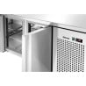 The refrigerated table is equipped with a ventilated cooling system, ensuring even temperature distribution between 0 and 10°C throughout its 365-liter volume. This precise temperature maintenance ensures the freshness and quality of stored ingredients, essential for kitchens that care about culinary excellence and meeting hygiene standards.