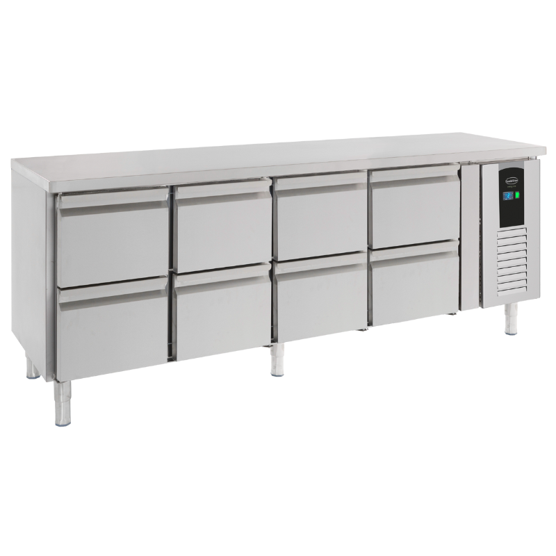 Thanks to its generous dimensions (1360 x 700 x 950 mm) and an optimized interior volume of 147 liters, this model offers substantial storage space while remaining compact. Its four spacious drawers allow for efficient sorting of products, facilitating access and stock management. Designed for ease of use, this refrigerated table does not clutter the workspace and integrates harmoniously into any professional kitchen.