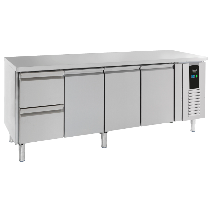 Finally, the design includes a backsplash that helps protect walls from splashes, thus enhancing the cleanliness and organization of the workspace. With a usage capacity in conditions up to 30°C, this refrigerated counter is perfectly suited to the most demanding kitchen environments.