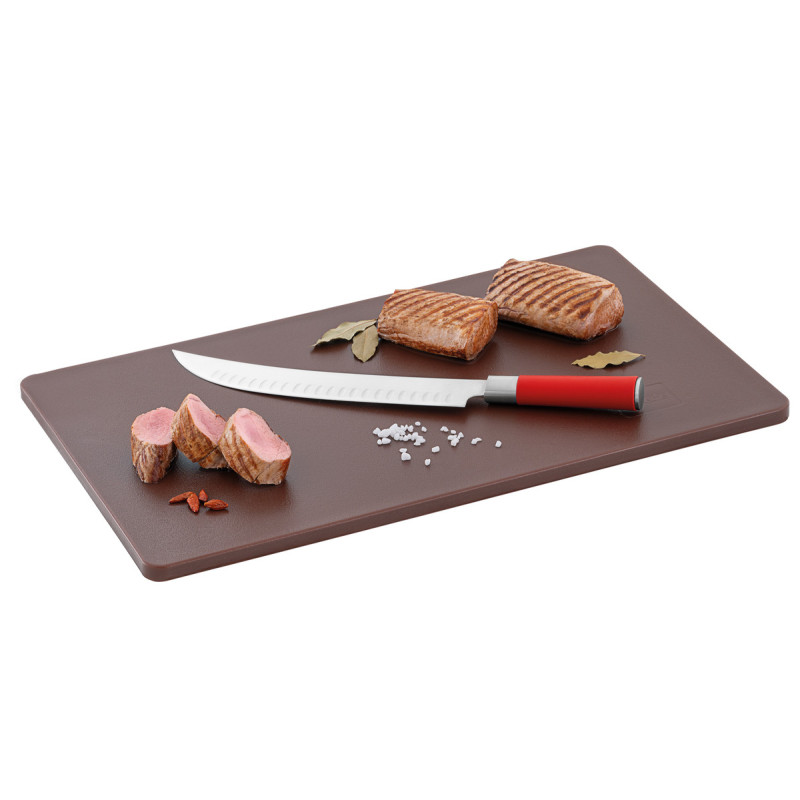 Elle est dotée d'un coté lisse et d'un côté avec rigole afin d'éviter les écoulements. Les deux côtés conviennent parfaitement à la découpe. Elle peut être lavée au lave-vaisselle professionnel, programme court de préférence. Elle est idéale pour les professionnels de la restauration.