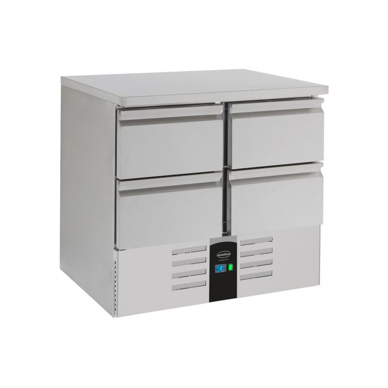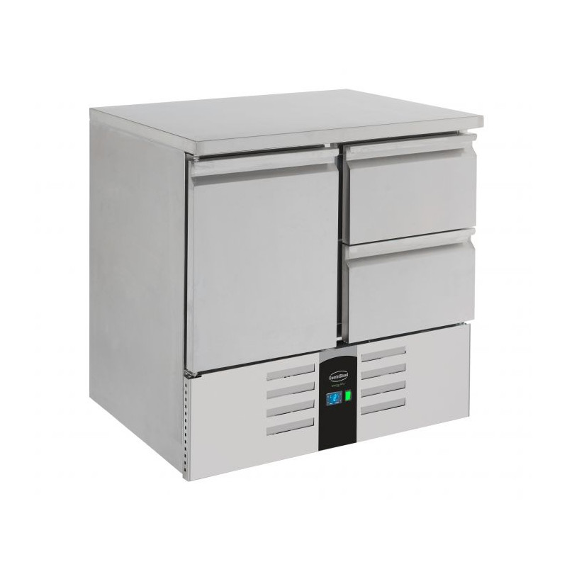 La table est équipée d'une porte battante pleine et de deux tiroirs, tous configurés pour accueillir des plaques ou des grilles au format GN 1/1. Ceci permet une organisation flexible et une accessibilité aisée aux ingrédients stockés, optimisant ainsi les flux de travail en cuisine. Le thermostat intégré offre un contrôle précis des températures, essentiel pour la sécurité alimentaire.