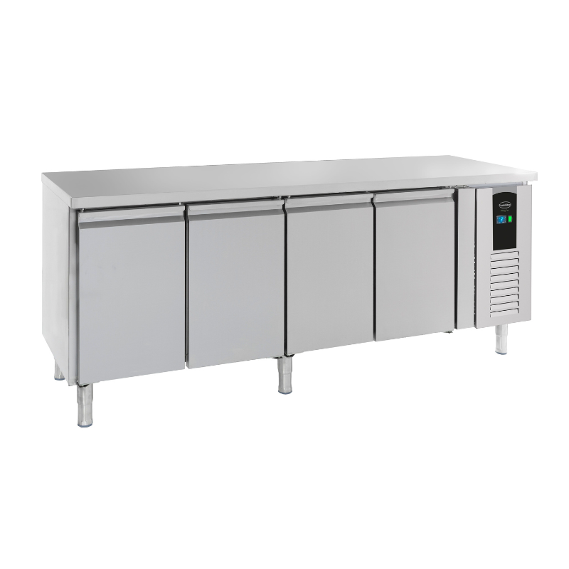 A mesa está equipada com três portas de batente cheias, ideal para acessar facilmente os produtos enquanto minimiza a perda de frio. O backsplash previne a perda de alimentos atrás da unidade e melhora a higiene ao simplificar a limpeza. Além disso, com uma alimentação de 220 V e uma potência de 435 W, ela combina economia de energia e eficiência, graças também ao uso do gás refrigerante R290, com impacto ecológico reduzido.